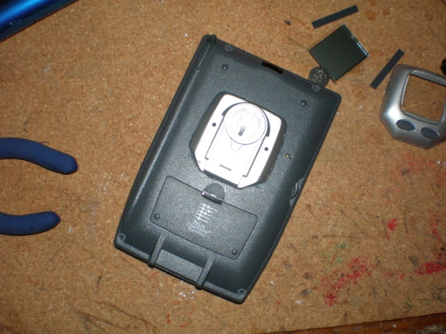 A solution like the original bike computer would be ideal. It is a small device that slides into a fixture on the steer of your bike. If only I could reuse that fixture for my Palm III. Well, that is just what I did. I took the bike computer apart, which luckily was very cheap at around 3 euros. The lower part of the shell contained the physical connector to the fixture. It has two metal contacts that connect to the wires of the sensor when you slide it into the fixture. I hot-glued this lower shell to the back side of my Palm III.