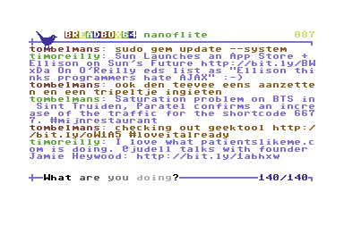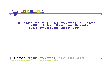With BREADBOX64 you can post status messages and view your friends timeline. The timeline refreshes every two minutes. After starting you provide your twitter username and password separated by a colon. After pressing enter, the timeline is retrieved and shown. At the bottom of the screen there is an input field for you to type aq status message. Pressing enter will post that message to twitter.