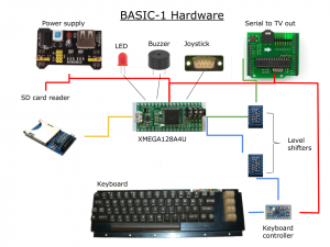 I really wanted a way to store programs on the BASIC-1, we could do that on the XMega itself, via flashing the program to a part of the program memory. Or I could use a tape cassette (like the datasette from Commodore), but I settled on using an SD card instead. This is a nice way to exchange programs from my macbook anyhow. The downside is that the SD card library takes a lot of the precious memory away from BASIC. I’m using the FatFS module for this.