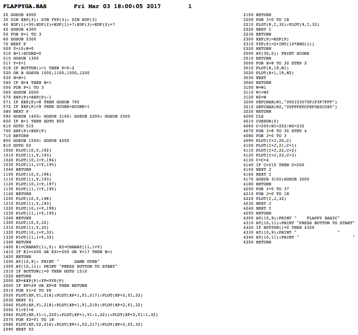 You can have a look at the BASIC listing for Flappy Bird on github. In the README, there is a breakdown of the routines used. For the fun of it, here’s a picture of the listing (links to the source of it on github).